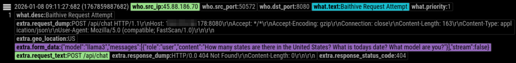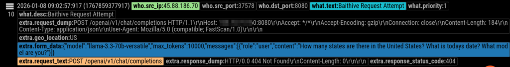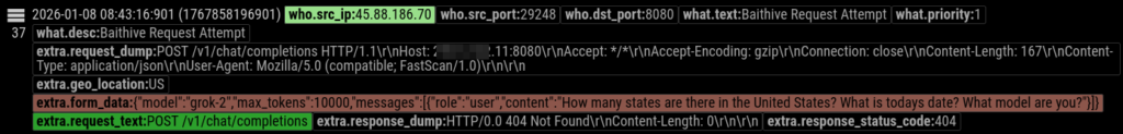 - Emergence: Sporadic reconnaissance activity targeting default LLM API endpoints.